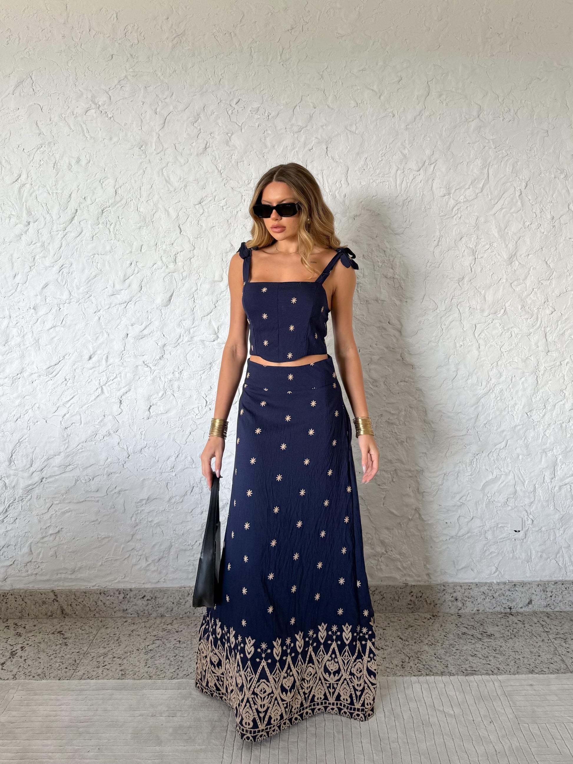 Conjunto Saia Longa e Top Navy Bordado – Elegância Étnica e Charme Celestial