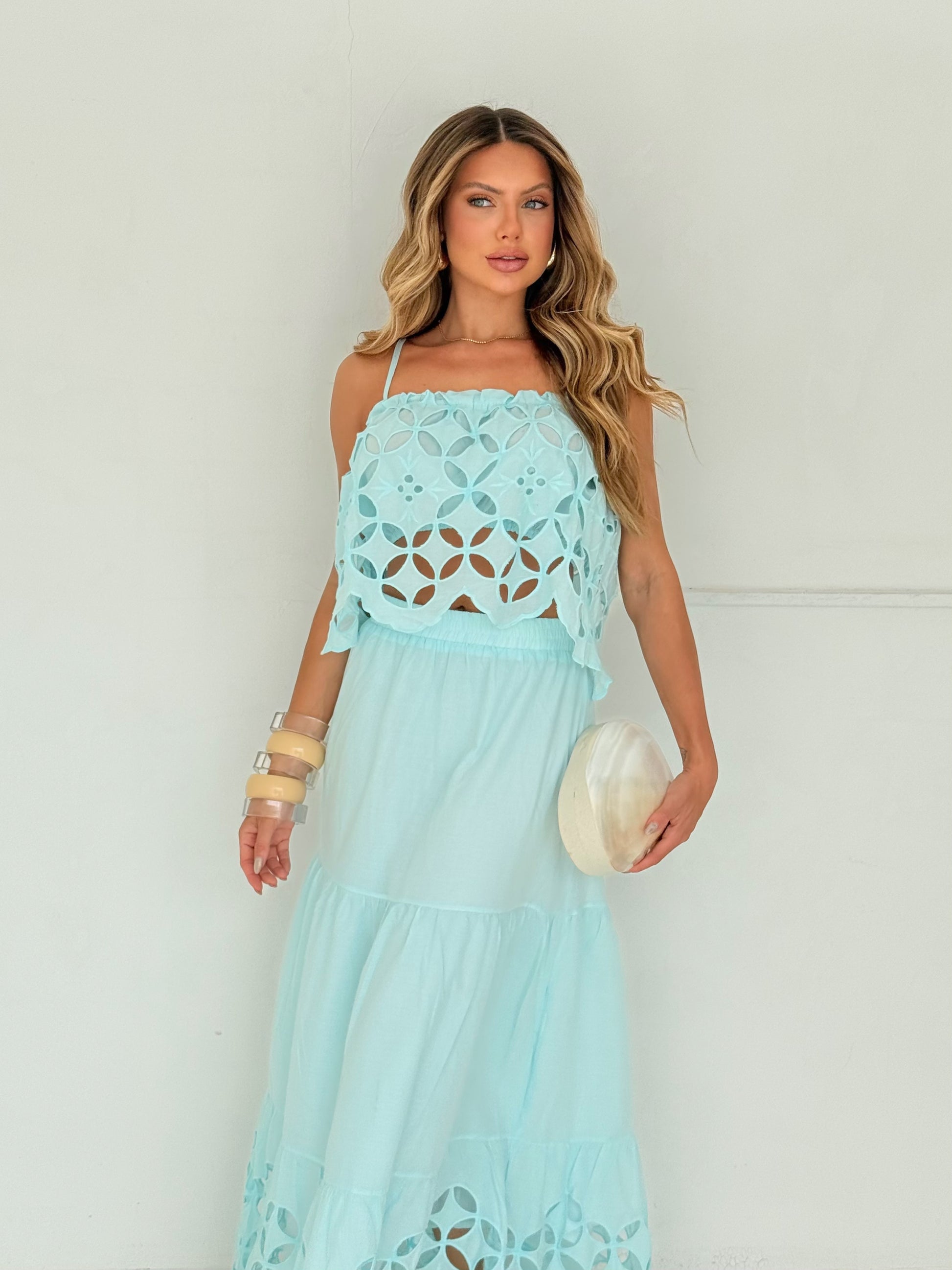 Cropped com Detalhe em Renda: O top ajustado possui alças finas e um recorte no decote e na barra adornado com renda branca delicada.