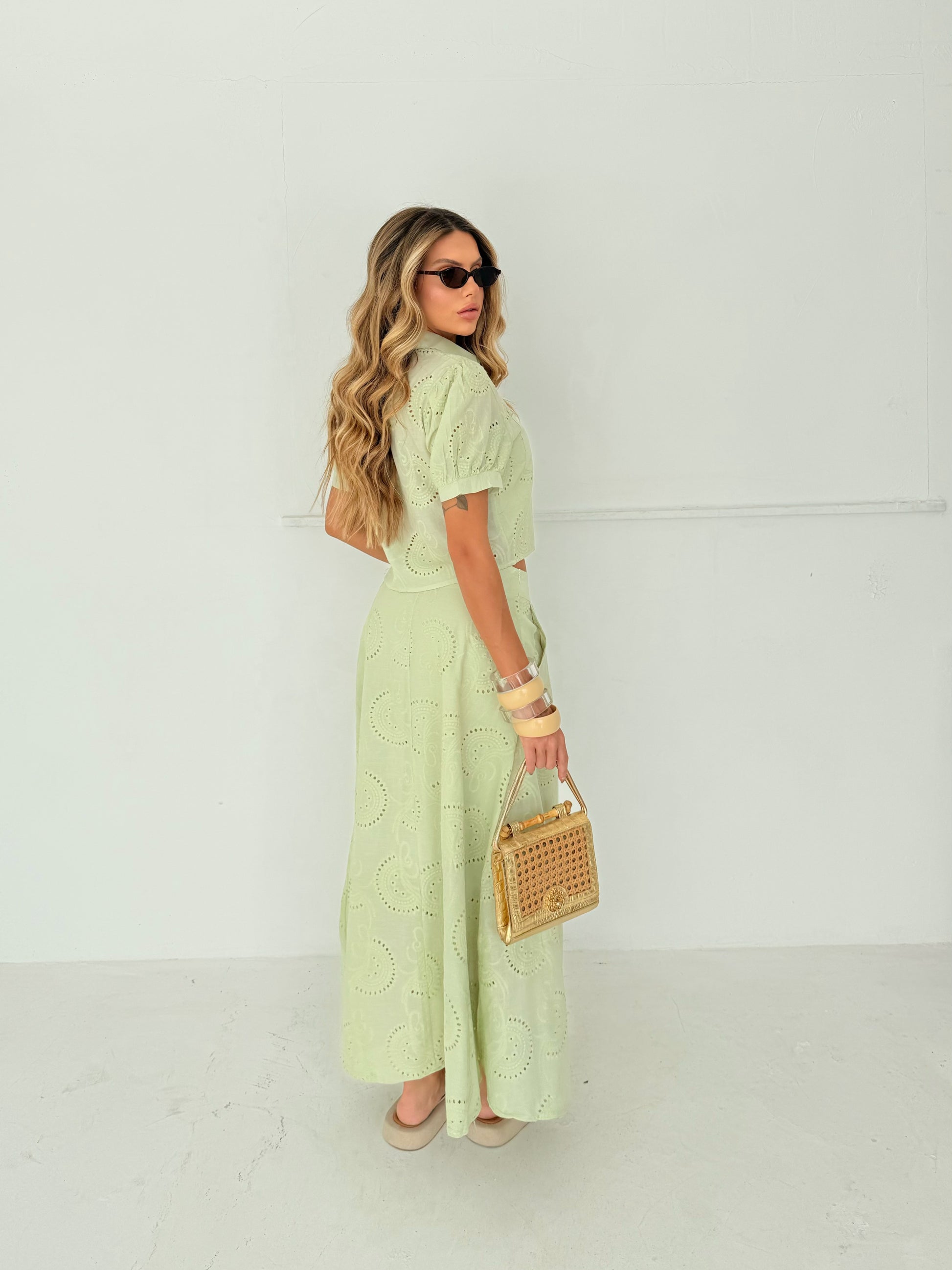 Conjunto Saia Longa e Camisa Verde Lima – O Charme Delicado do Richelieu e o Frescor Vibrante