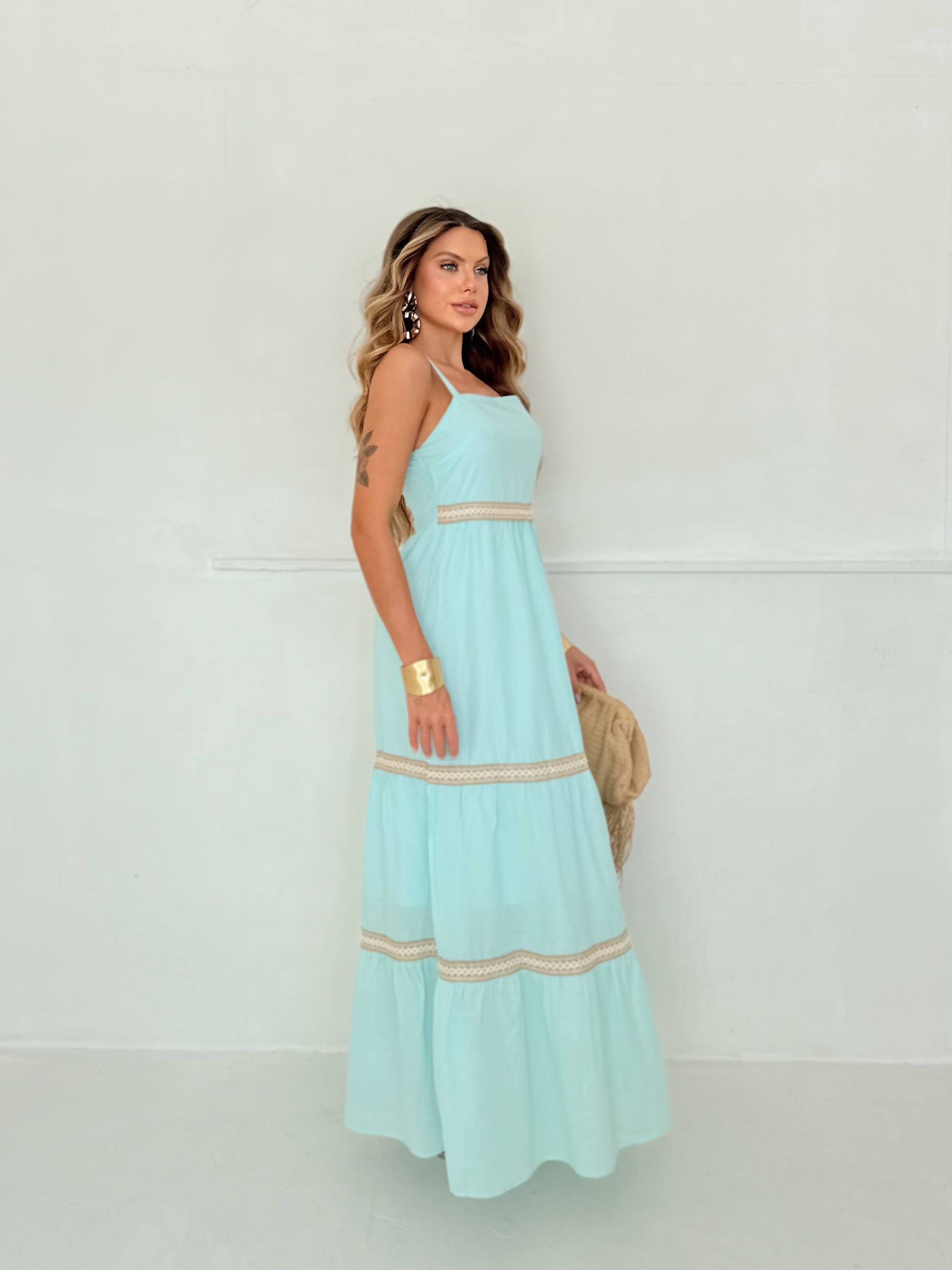 Vestido Longo Azul Claro com Detalhes em Renda – Leveza Romântica e Elegância Natural