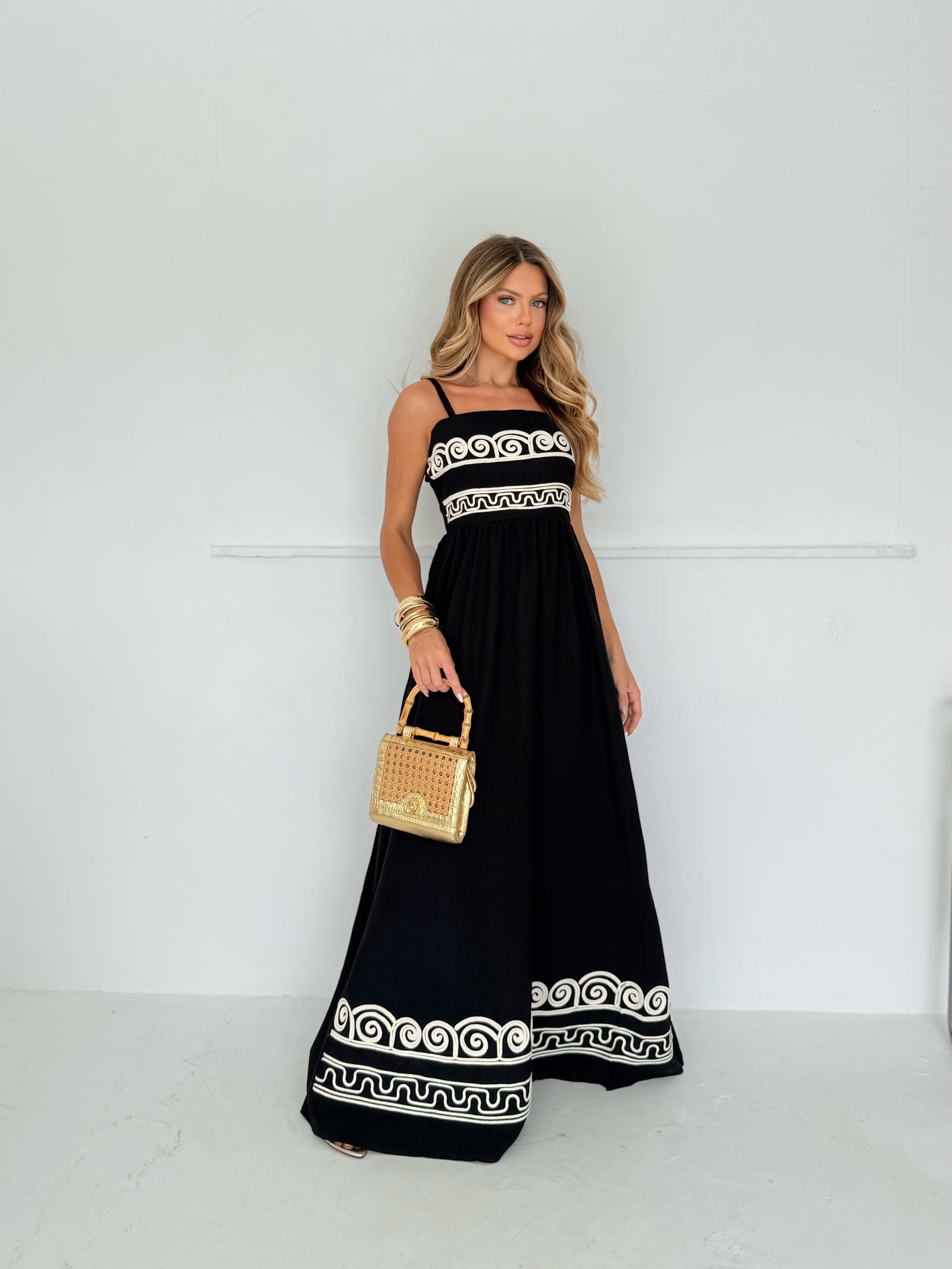 O contraste entre o preto intenso e os bordados em bege faz deste vestido uma peça atemporal e versátil, perfeita para produções elegantes do dia à noite.